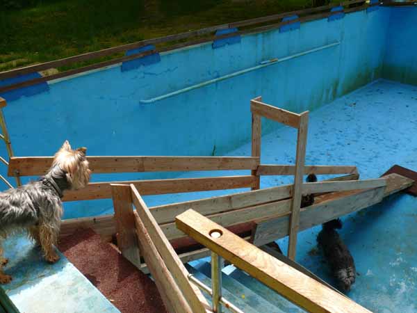 Eine Holzterrasse neben dem Pool. Tja.. Hund sollte man sein. :) |
